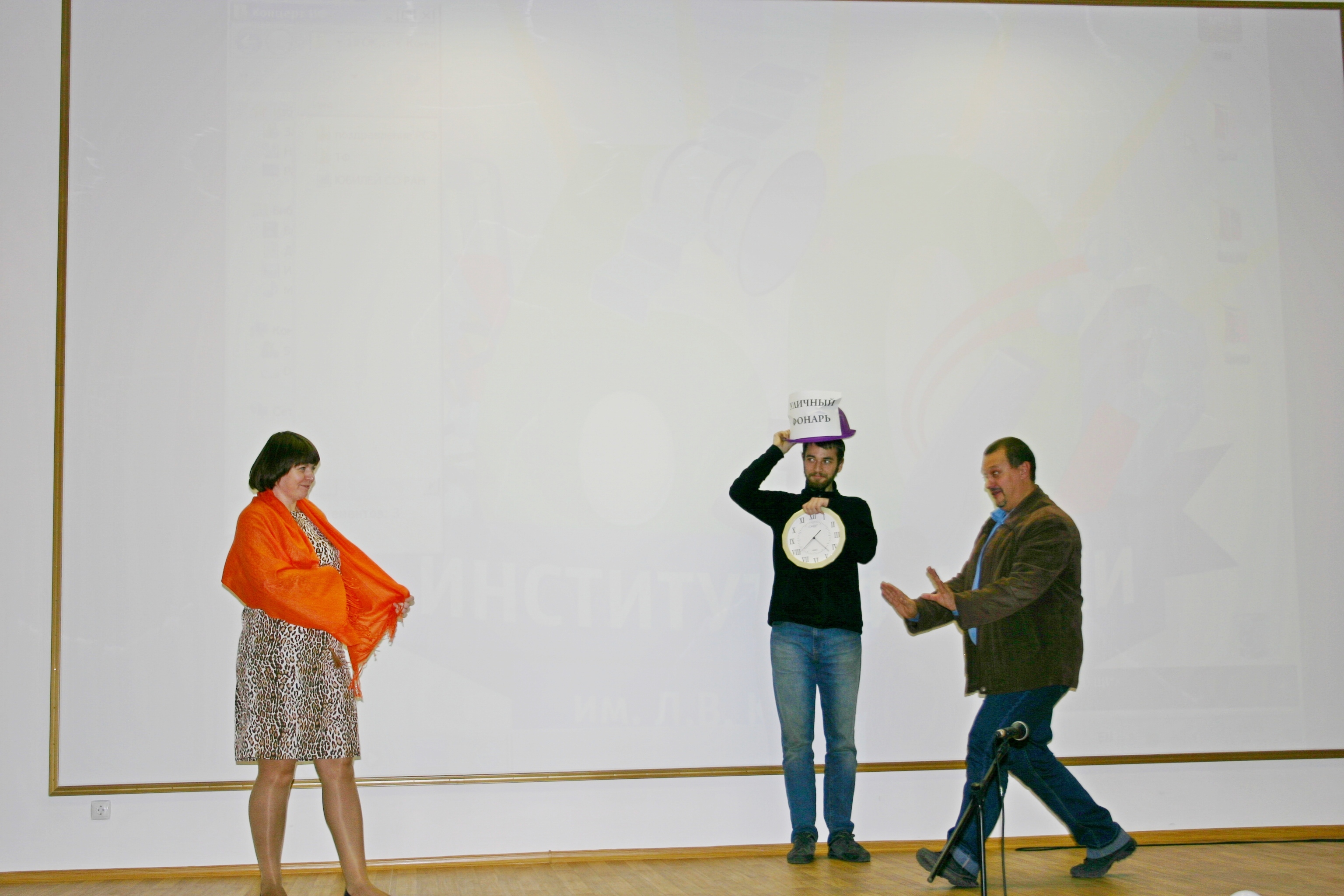 12 октября 2016 года. На празднике в честь 60-летия Института физики им. Л.В. Киренского Сибирского отделения Российской академии наук (ИФ СО РАН). Участники художественной самодеятельности лаборатории физики магнитных явлений: О.С. Иванова, М.А. Высотин (в центре) и А.Э. Соколов. Красноярск.