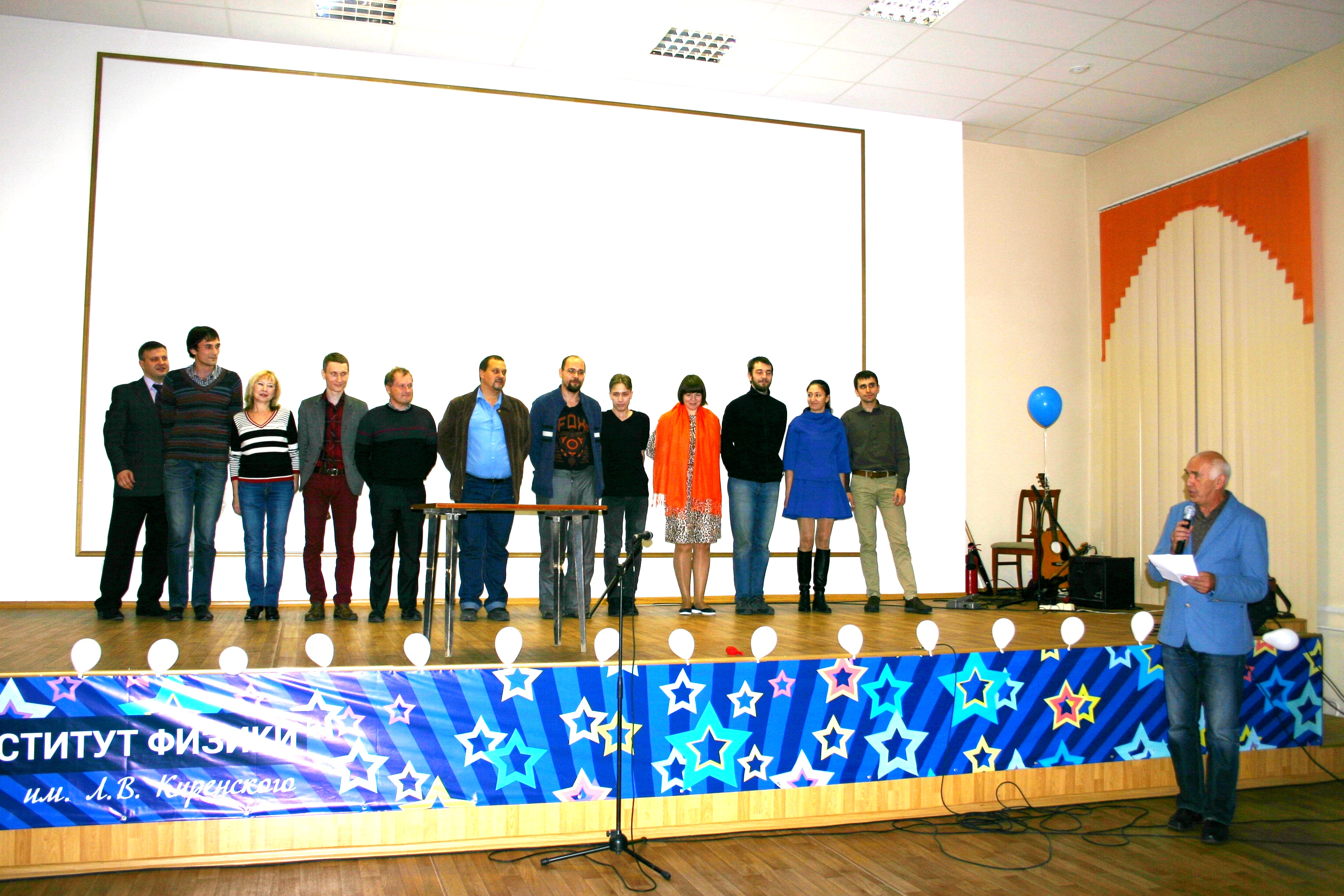 12 октября 2016 года. На празднике в честь 60-ия Института физики им. Л.В. Киренского Сибирского отделения Российской академии наук (ИФ СО РАН). Участники художественной самодеятельности лаборатории физики магнитных явлений, слева направо: Ф.Н. Томилин, С.А. Ляшенко, О.Н. Бруштунова, И.А. Яковлев, А.С. Федоров, А.Э. Соколов, Д.А. Петров, В.И. Кузьмин, О.С. Иванова, М.А. Высотин, Е.И. Шнейдер, И.А. Тарасов. С микрофоном С.Г. Овчинников, заведующий лабораторией.