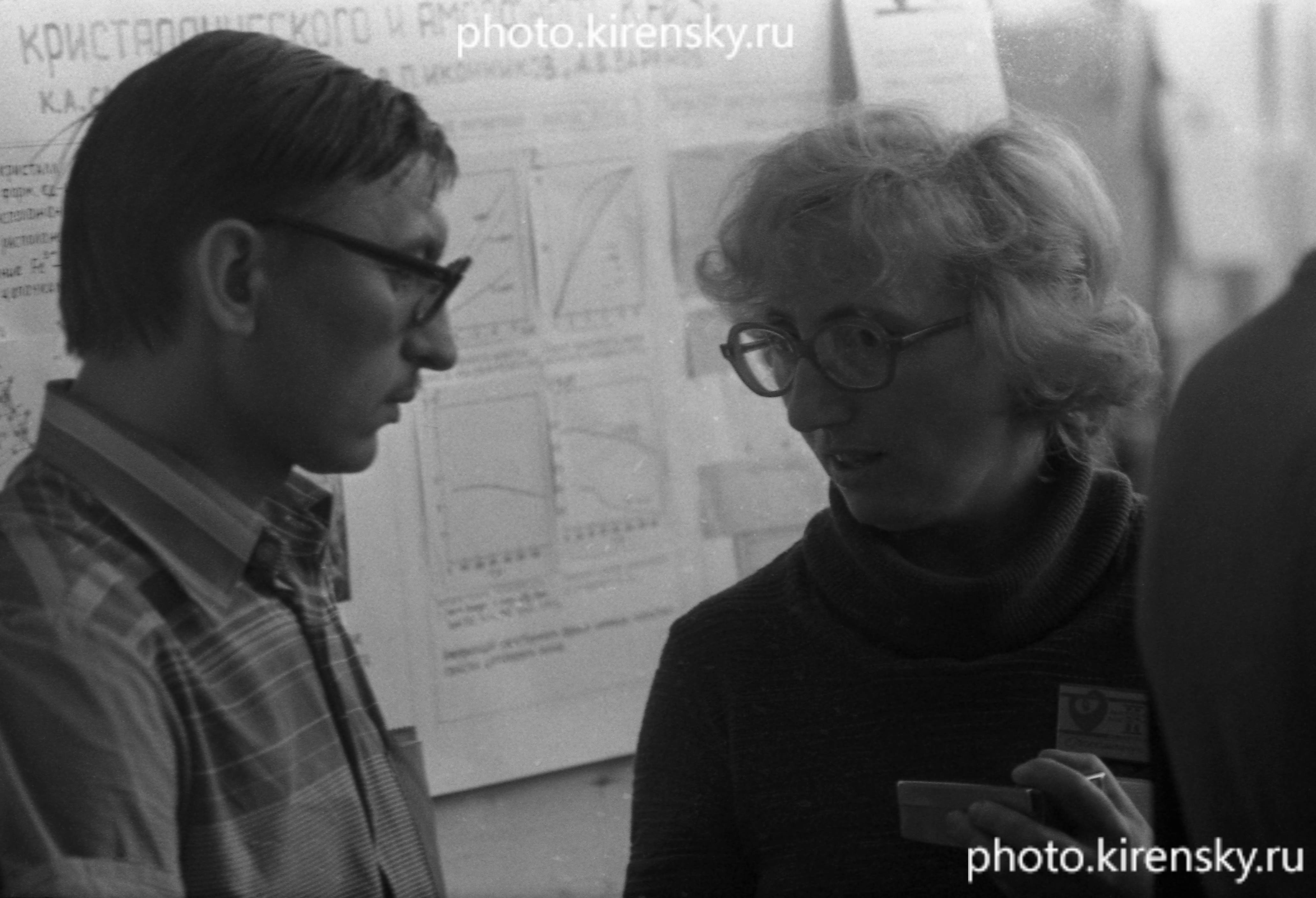 Саблина К.А. на Всесоюзной конференции по аморфному магнетизму, организованной и проведенной Институтом физики им. Л.В. Киренского Сибирского отделения Академии наук СССР (ИФ СО АН СССР) в 1986 году в г. Дивногорске (Красноярский край), с гостем конференции у стендового доклада.