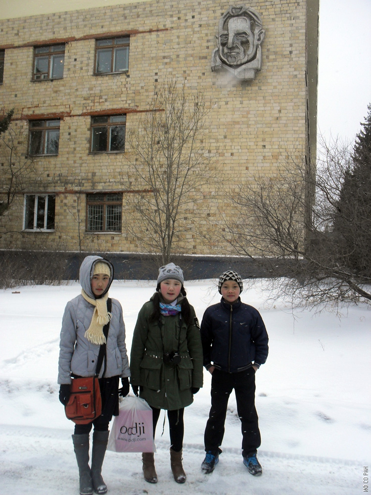 Слева направо: Степанова Оля, Соломонова Мария, Птицын Виталий на фоне главного корпуса института. На здании горильеф С.П. Королева, выполненный известными скульпторами Н.А. Силисом и В.С. Лемпортом, творчество которых очень ценил Л.В. Киренский, поэтому памятник на могилу Леонида Васильевича был заказан этим скульпторам и еще в изготовлении его участвовал скульптор Л.В. Соколов.