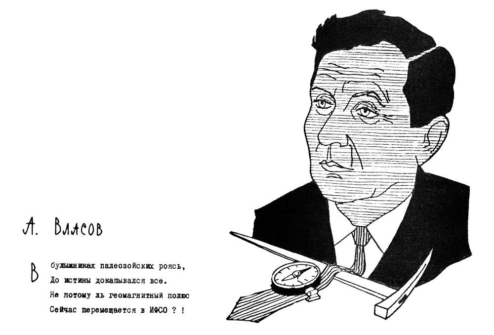 Дружеский шарж Власова А.Я. из книги шаржей "Музей друзей", первая часть которой вышла в 1967 году. Авторами ее являются научные сотрудники института О.А. Баюков и Н.С. Чистяков. Книга вышла малым тиражом (всего 100 экземпляров) и моментально разошлась среди персонажей книги, сотрудников и была подарком авторов к юбилею института, 1967 год.