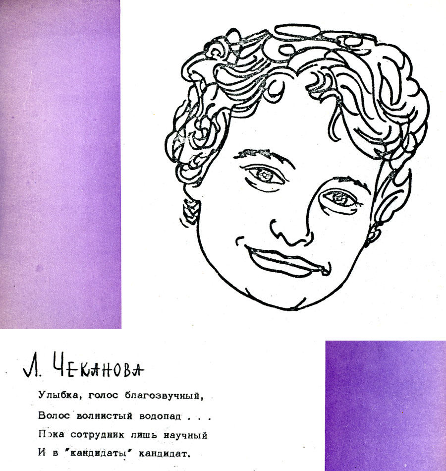 Дружеский шарж Чекановой Л.А. из книги "Музей друзей", изданной научными сотрудниками Института физики Сибирского отделения Академии наук СССР (ИФ СО АН СССР) Олегом Артемьевичем Баюковым и Николаем Сергеевичем Чистяковым. Удивительная книжка дружеских шаржей и эпиграмм на сотрудников Института физики СО АН СССР. Она вышла в 1967 году к 10-летию начала работы института. Вышла небольшим тиражом в 100 экземпляров и распространялась строго по списку, лично в руки. Узнать себя на страницах книги смогли 48 самых ярких и заметных личностей молодого института. Позже (в 1971 году) вышла вторая книга под таким же названием. Что побудило их взяться за такой труд, авторы подробно изложили в предисловии к первой и второй книгам. Книги размещены на сайте.
