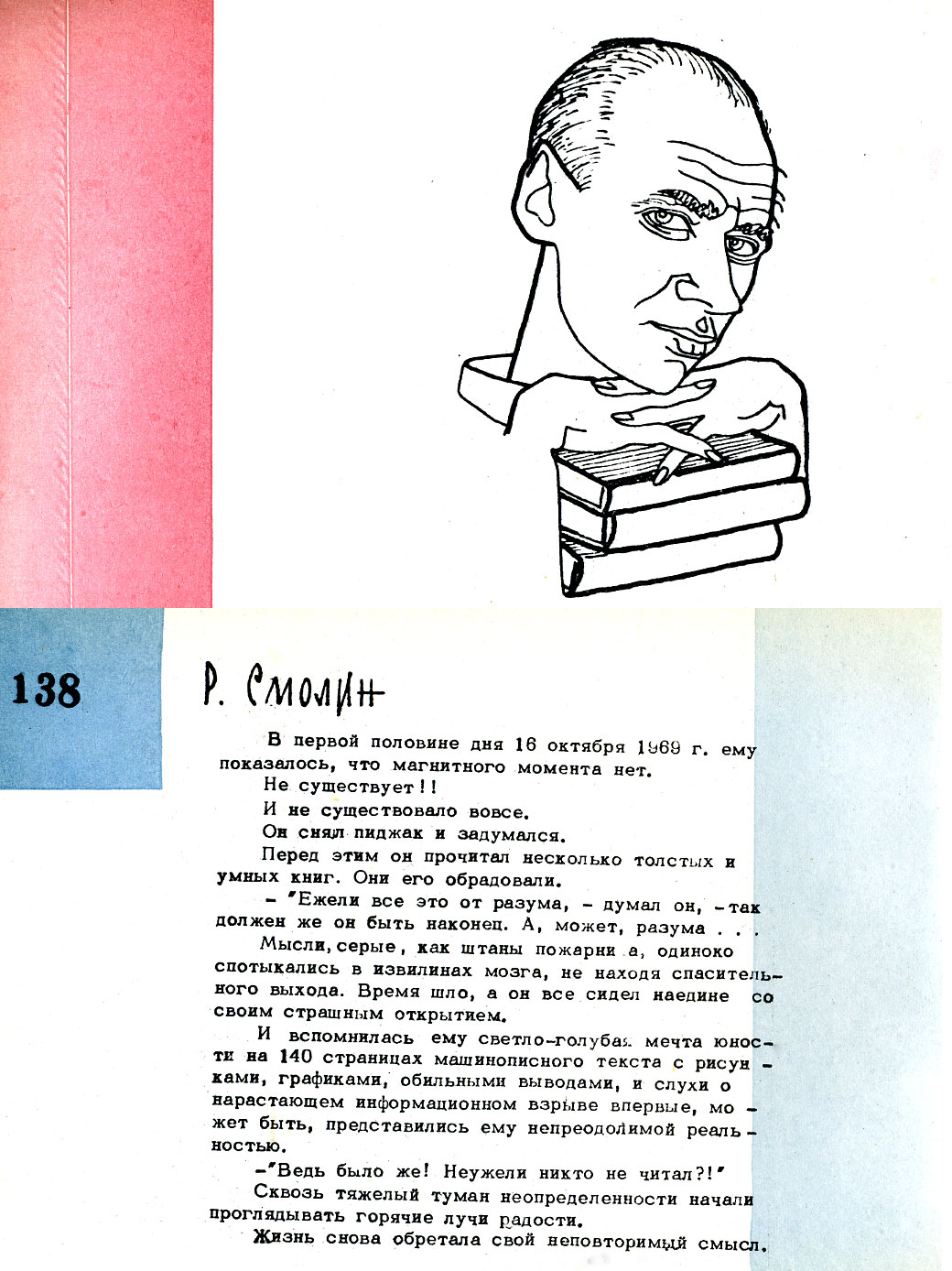 Дружеский шарж Смолина Р.П. из книги "Музей друзей", изданной научными сотрудниками Института физики Сибирского отделения Академии наук СССР (ИФ СО АН СССР) Олегом Артемьевичем Баюковым и Николаем Сергеевичем Чистяковым. Удивительная книжка дружеских шаржей и эпиграмм на сотрудников Института физики СО АН СССР. Она вышла в 1967 году к 10-летию начала работы института. Вышла небольшим тиражом в 100 экземпляров и распространялась строго по списку, лично в руки. Узнать себя на страницах книги смогли 48 самых ярких и заметных личностей молодого института. Позже (в 1971 году) вышла вторая книга под таким же названием. Что побудило их взяться за такой труд, авторы подробно изложили в предисловии к первой и второй книгам. Книги размещены на сайте.