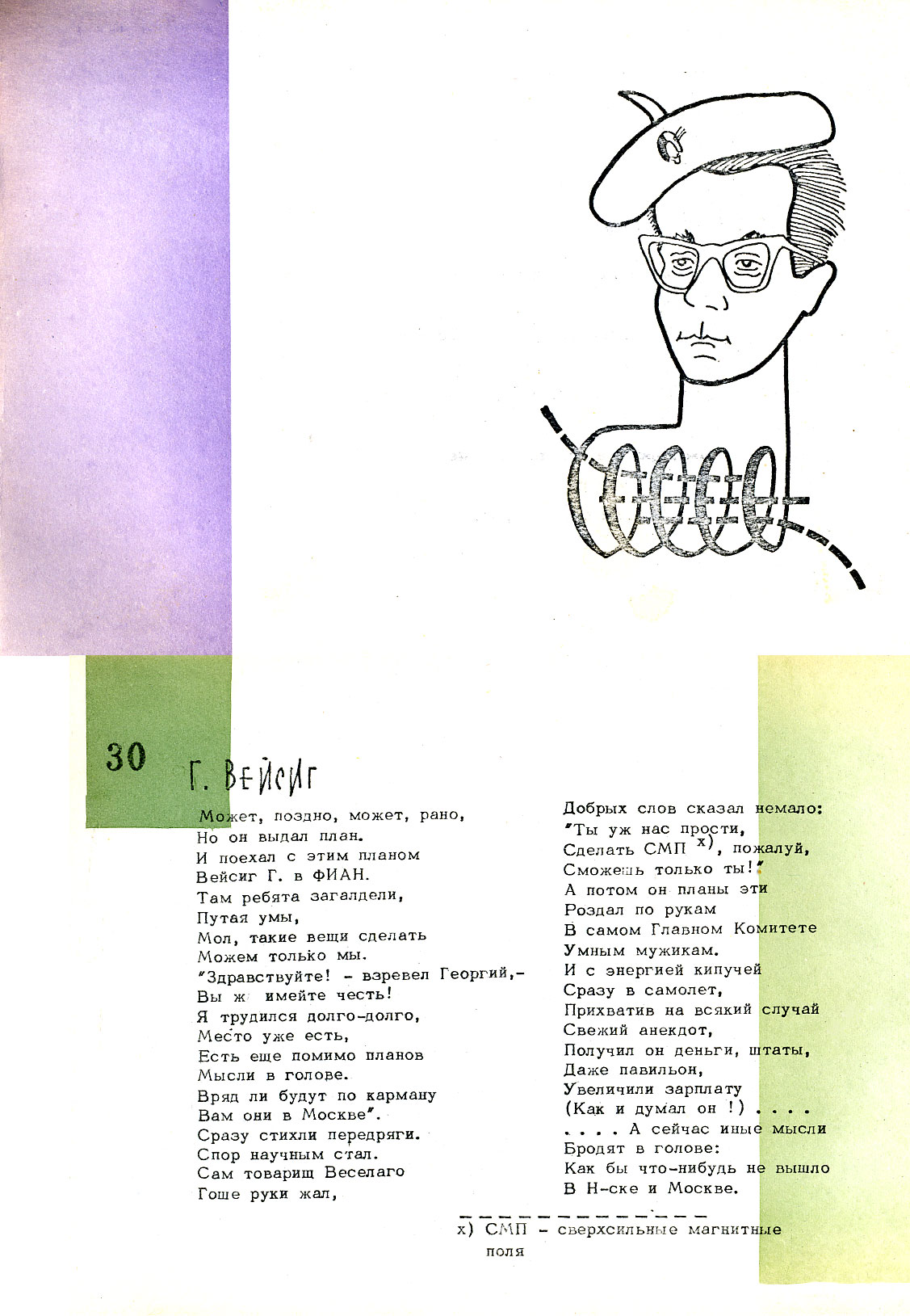Дружеский шарж Вейсига Г.С. из книги "Музей друзей", изданной научными сотрудниками Института физики Сибирского отделения АН СССР Олегом Артемьевичем Баюковым и Николаем Сергеевичем Чистяковым. Удивительная книжка дружеских шаржей и эпиграмм на сотрудников. Она вышла в 1967 году к 10-летию начала работы института. Вышла небольшим тиражом в 100 экземпляров и распространялась строго по списку, лично в руки. Узнать себя на страницах книги смогли 48 самых ярких и заметных личностей молодого института. Позже (в 1971 году) вышла вторая книга под таким же названием. Что побудило их взяться за такой труд, авторы подробно изложили в предисловии к первой и второй книгам. Книги размещены на сайте. Красноярск.